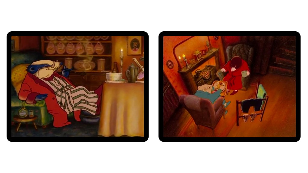 At this dinner, badger is shown in a state of evening ease, resplendent in striped pyjamas, a red dressing gown with turnback cuffs, slippers on and churchwarden pipe in hand. Similar getups involving shawl collar robes with rope belts and accented piping appear in other scenes. It all ends up looking like something out of an anthropomorphised New & Lingwood editorial shot…