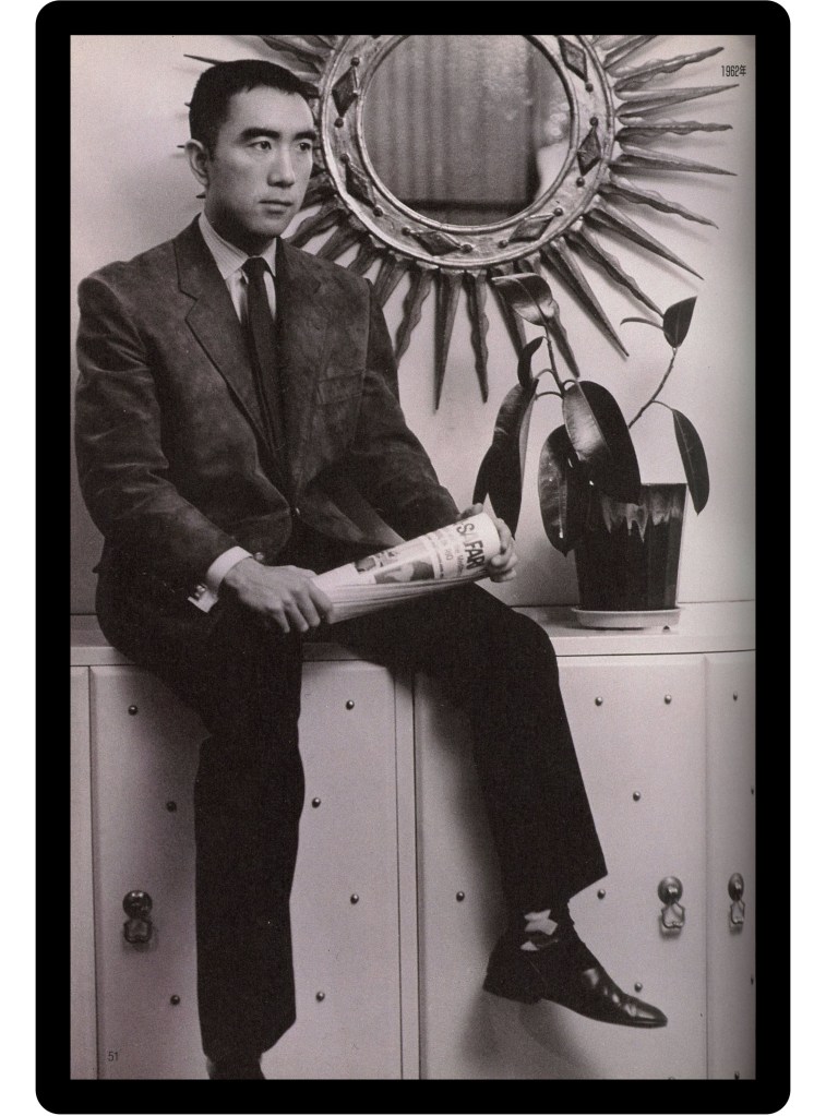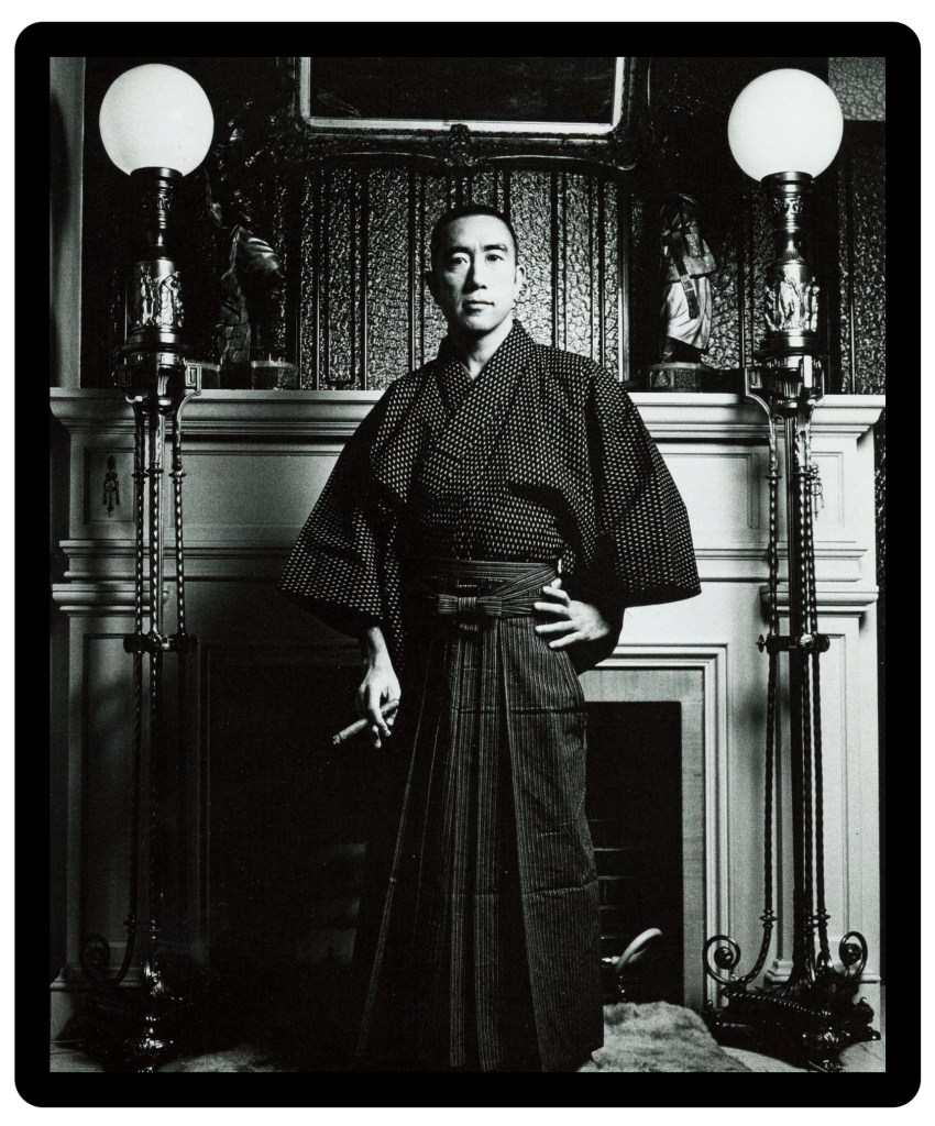 One of the few distinctly Japanese outfits Mishima wears in the book is this traditional ensemble featuring a Jacquard patterned Kimono and striped Hakama trousers. Standing next to his Art Deco lamps and with cigar in hand, he projects an image of a gentleman who is both rakish and refined. Worldly and outward looking, yet fiercely Japanese, with the credentials to back it up. One could potentially see Mishima’s home as a work of kitsch, a kind of attempt to recreate vague material notions of what it meant to be an ‘aristocrat’. But I think there was enough taste in his curation to show that really he was a man who desired to live anachronistically, both for reasons of personal enjoyment and as a rejection of the more vulgar aspects of modernity. As such his dress sense was a rather subtle affair that blended ‘trad’ elements with a handful of contemporary ones, forming a wardrobe that would not distract, but instead compliment Mishima’s journey toward his final destination: immortality via everlasting image. It appears he may well have achieved it…