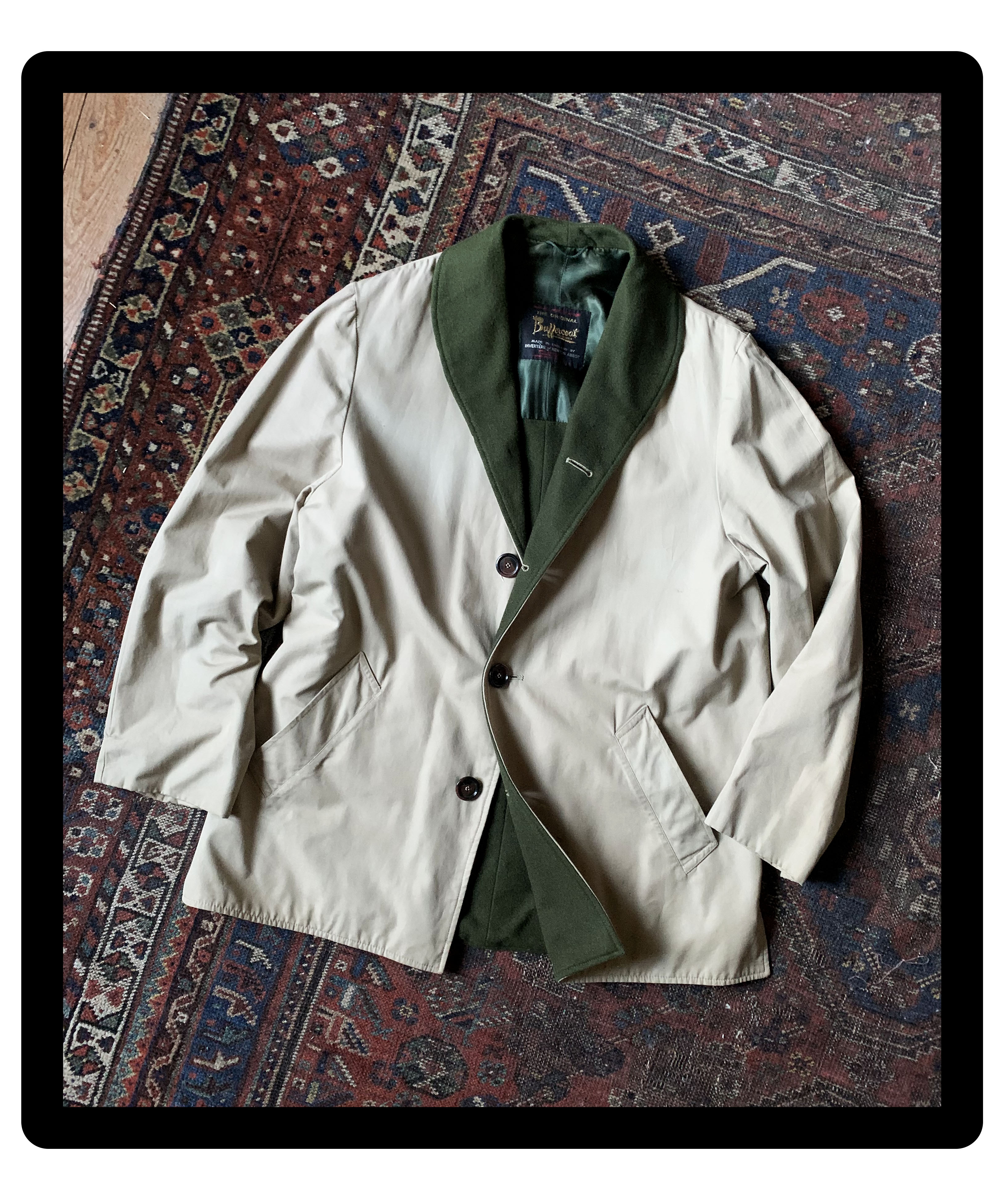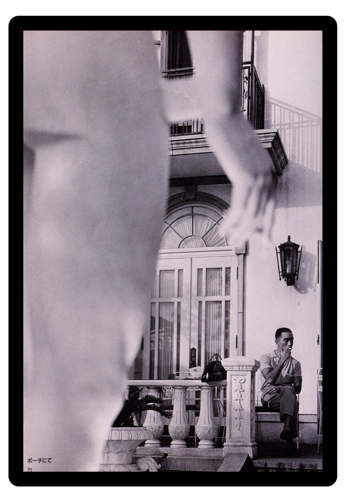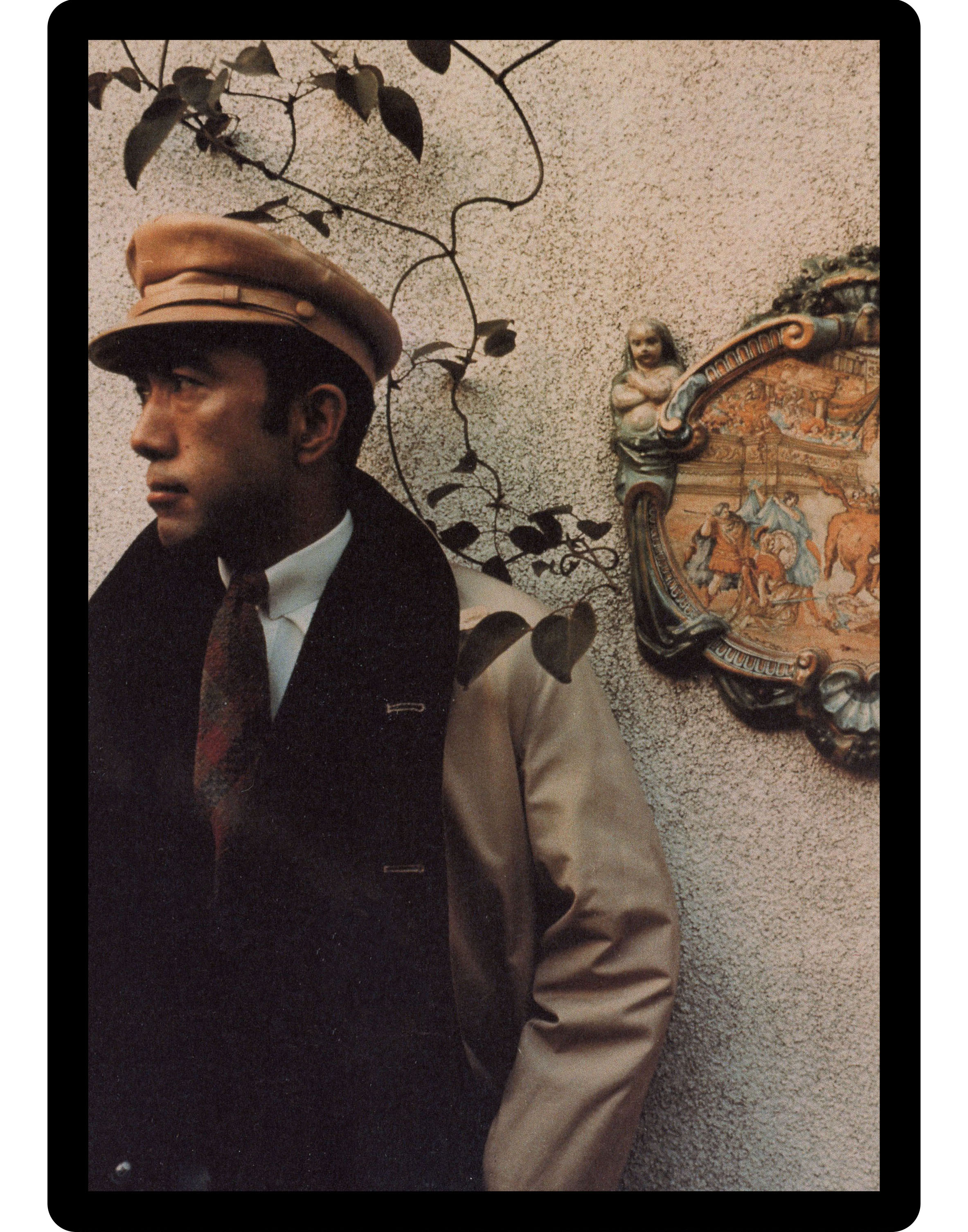 Interspersed between the liminal portraits of the rooms are some choice shots of Mishima that display his taste in dress. I was particularly pleased to see an image of him wearing a style of jacket known as a ‘Buffercoat’. A rather esoteric example of English country wear, the Buffercoat is marked by its distinct shawl collar which can be flipped up and fastened via a tab in order to provide a ‘buffer’ against the wind. It almost certainly would have been made by the famous ‘Invertere Of Newton Abbot’, who were a British coat manufacturer that produced under their own label, and also for Daks. Both brands were once owned by the department store Simpsons Of Piccadilly, so it is likely that Mishima would have picked up his one on a trip to London.
