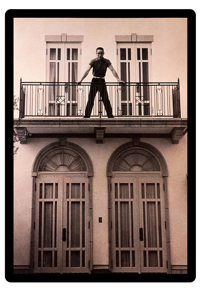 One recurring item you see Mishima wearing throughout the book and in photos elsewhere are polo shirts. His were quite eccentric by today’s standards, and were indicative of a more experimental period of mid-century design. This was a time when a polo may have been marketed as a ‘sport shirt’ or something along those lines. In the 1950’s through to the 1970’s, there was a lot of experimentation with certain details on these kinds of shirts, which you can see reflected in the styles worn by Mishima. In the book he is shown wearing one that has a very unique lace up collar. I suspect this was a detail appropriated from old Rugby shirts, so seeing it on a more ‘regular’ polo shirt with its finer cotton construction is quite unique (I have included another photo of him in a Black version that was found outside of the book).