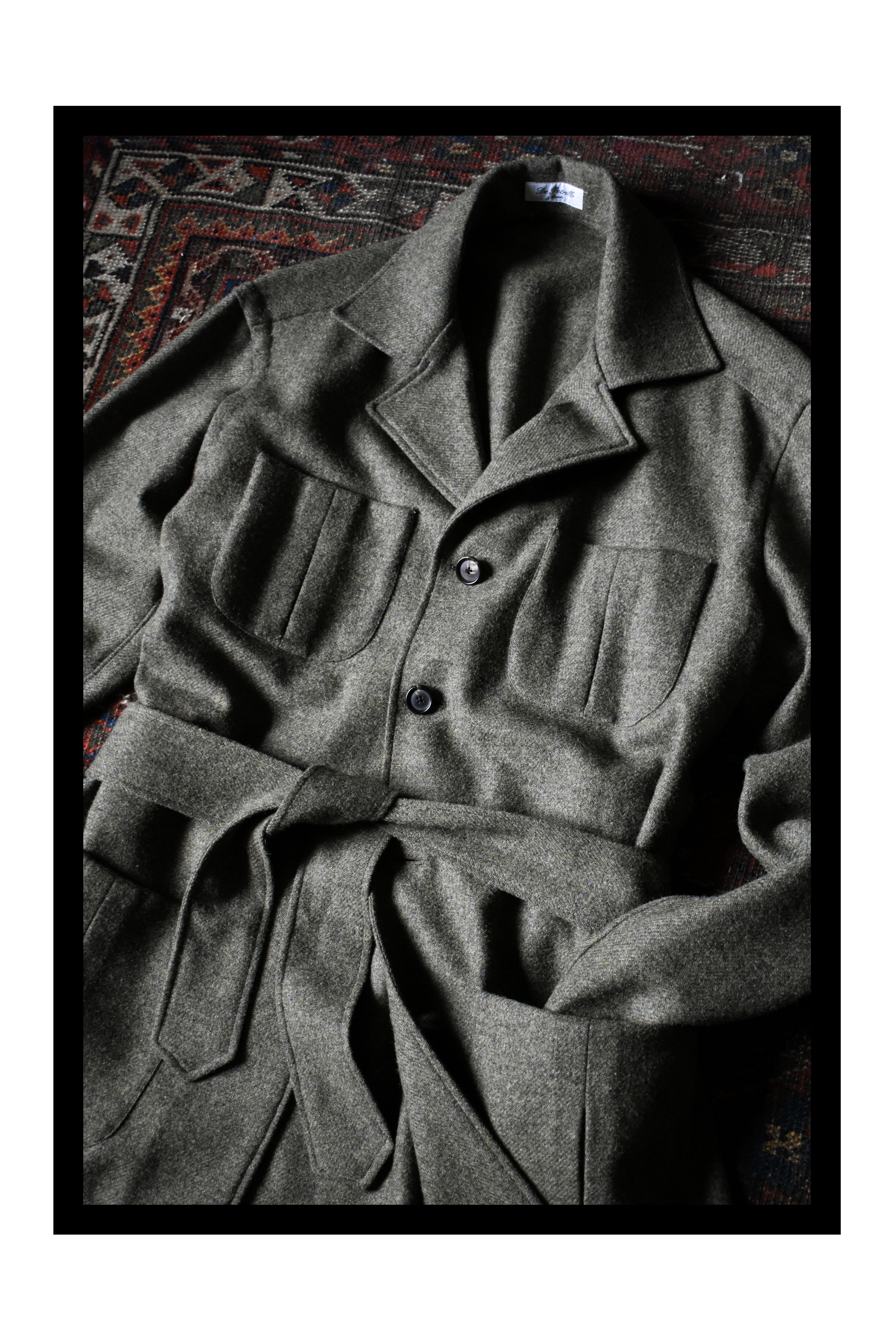 However, for those who wish to find a safari jacket that compliments their tailored trousers and fine gauge knitwear, I would recommend an ‘Elegant’ safari jacket. This variety is best exemplified by the Italian ‘Sahariana’ styles that Neapolitan tailors are known for. Stylistically they seem more inspired by 1970s patterns, and come with simpler pocket designs and sharp collars that sit a bit more flush on the shoulders. If a belt is present, it will be a very basic one that ties around the waist, as opposed to having a buckle system. I also find that some are cut a bit shorter, with the idea being that one wears them with a higher waisted trouser. The goal is to maintain the more practical elements of the original patterns, whilst upping the refinement in terms of fabric and finishing. The result is something that is very relaxed and cosy, yet highly presentable. In this regard, an Elegant safari jacket is almost akin to a dressing gown or smoking jacket (you really just feel at home in one!).